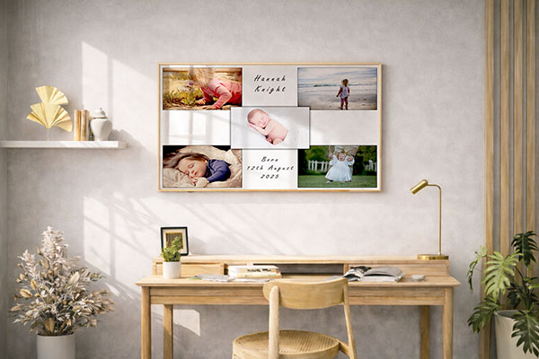 The early days pass quietly, yet everything changes. This personalised baby collage brings those fleeting moments together, tiny details, first expressions, the softness of a brand-new life, transformed into a refined piece of art designed to be treasured.